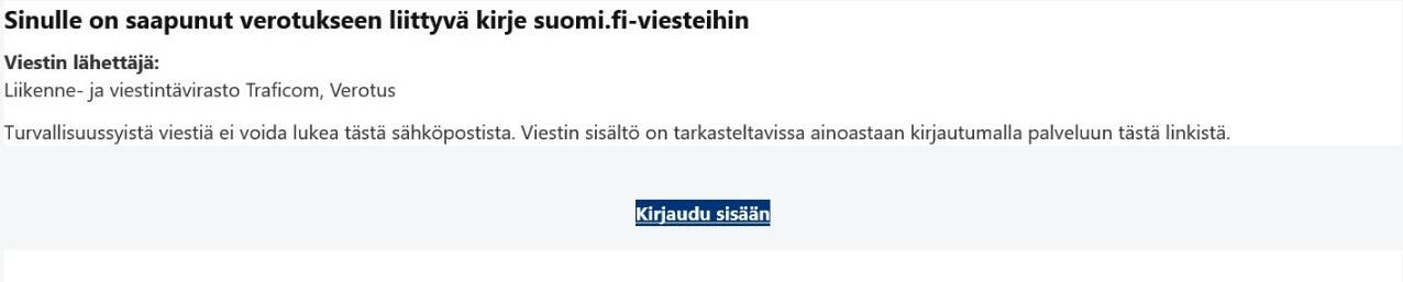 Varken Traficom eller Suomi.fi-meddelanden skickar några meddelanden med länkar via WhatsApp eller textmeddelande. När en person får ett nytt Suomi.fi-meddelande får personen en anmälan om det till sin e-post. I dessa e-postanmälningar finns dock aldrig någon länk som personen uppmanas att klicka på eller identifiera sig i.